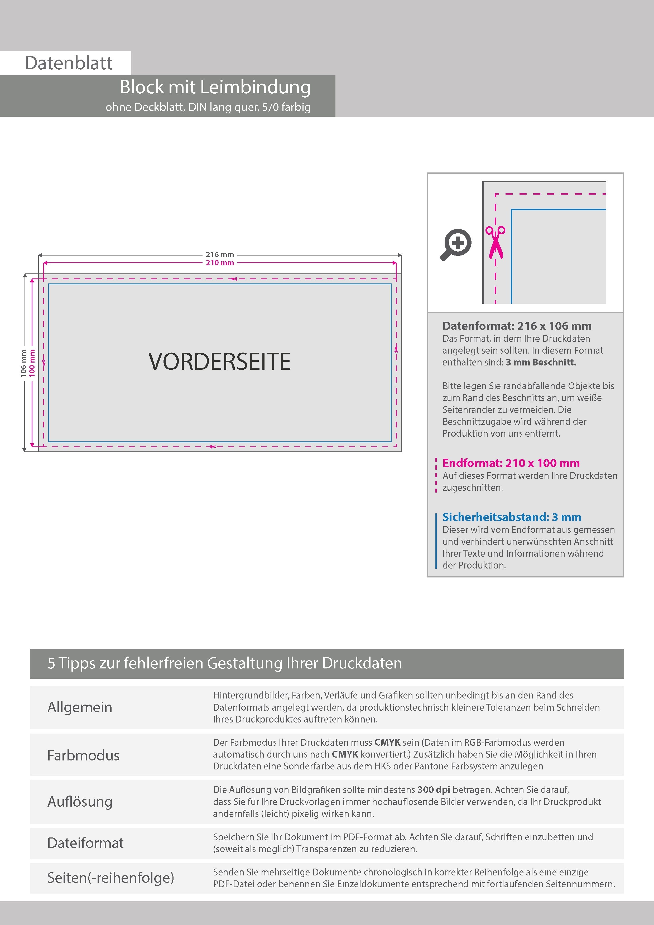 Block mit Leimbindung, DIN lang quer, 10 Blatt, 5/0 farbig einseitig bedruckt (CMYK 4-farbig + 1 Sonderfarbe HKS oder Pantone)