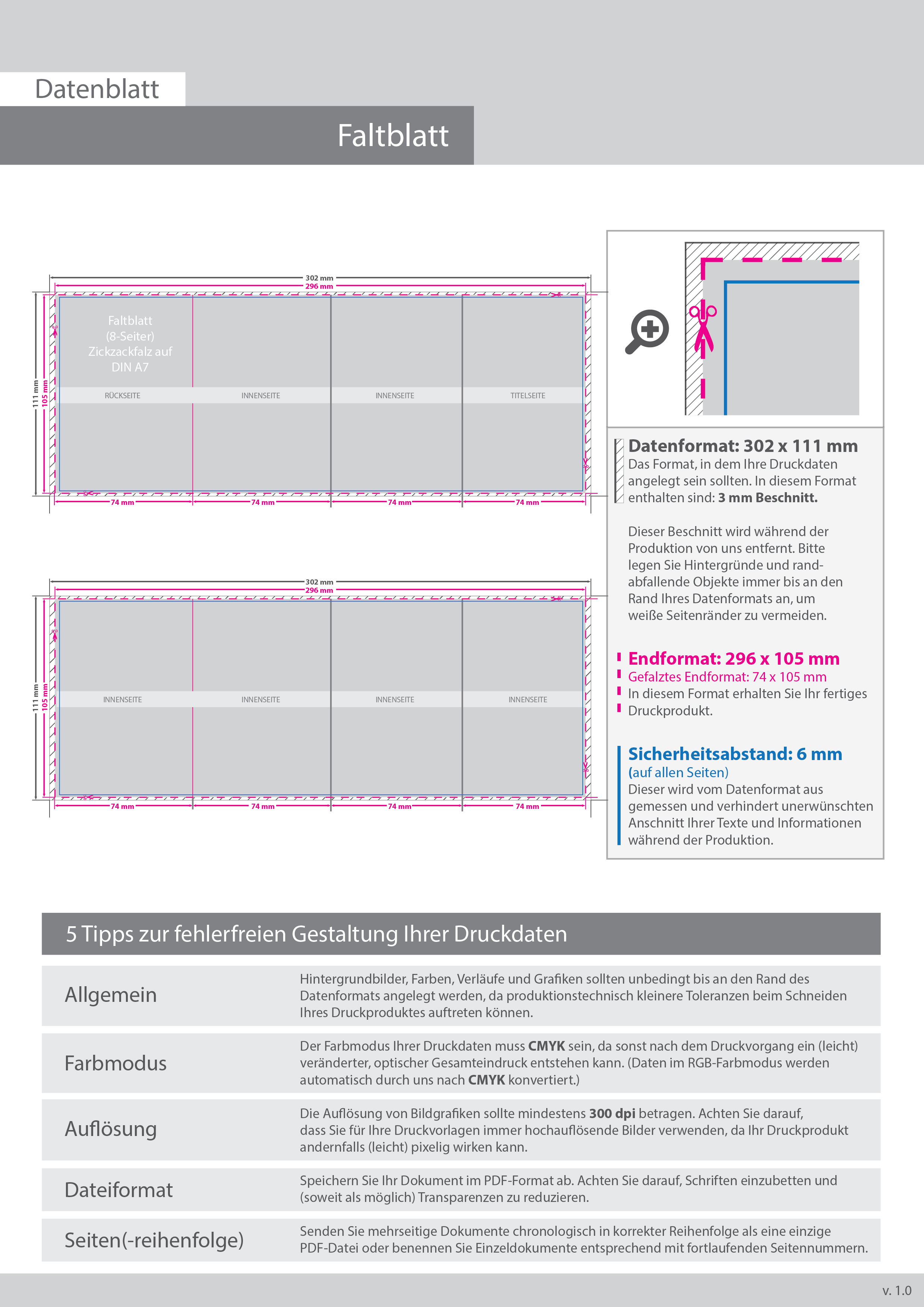 Faltblatt, gefalzt auf DIN A7, vertikaler Zickzackfalz, 8-seitig