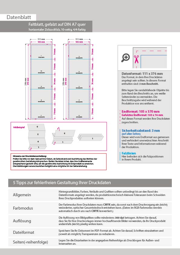 Faltblatt, gefalzt auf DIN A7 quer, horizontaler Zickzackfalz, 10-seitig