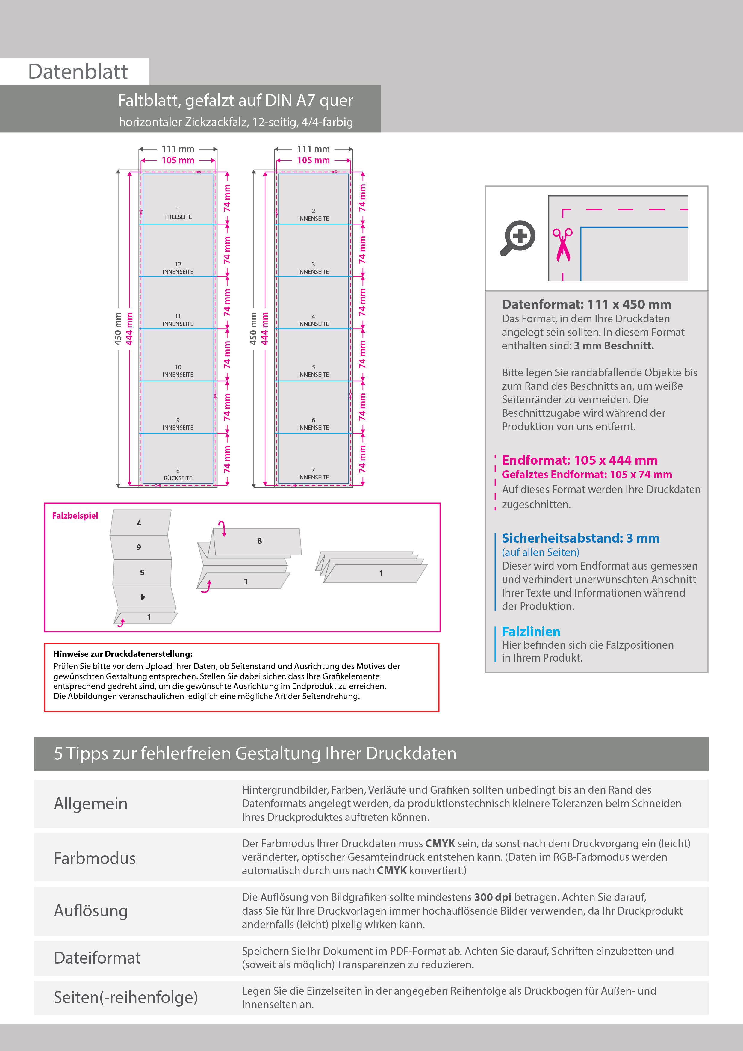 Faltblatt, gefalzt auf DIN A7 quer, horizontaler Zickzackfalz, 12-seitig